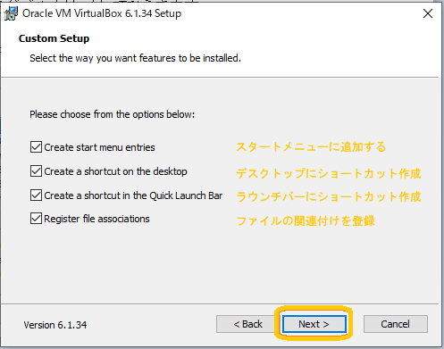 ※この画面のチェックボックスにチェックを入れると、インストール後に「VirtualBoxマネージャー」アプリが立ち上がります。