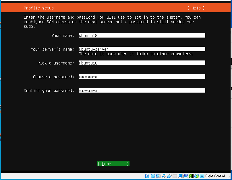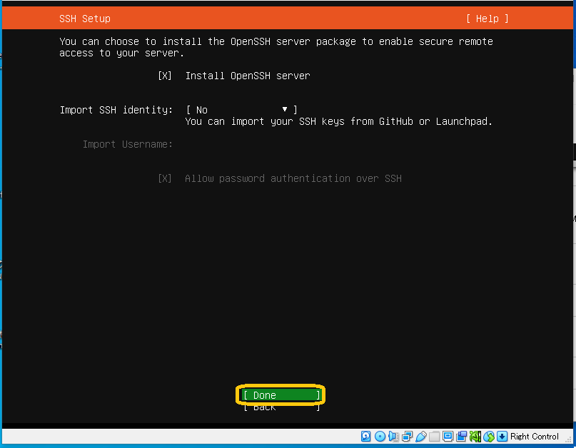 ⑰「SSH setup」画面では、「Install OpenSSH server」にチェックを入れて「Done」を押します