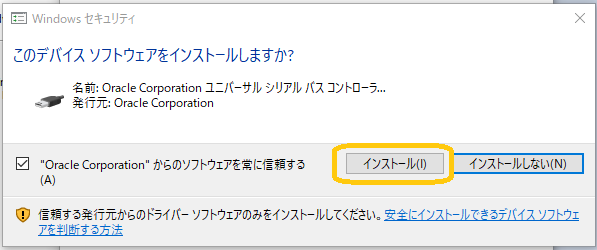 ⑩VirtualBoxを動作する時に必要なソフトウェアが有る場合、このようなダイアログが表示されるので「インストール」を押して、インストールします。