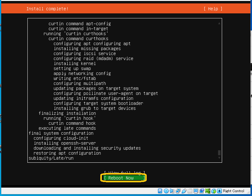 ⑲「Install complete!」画面で、「Reboot Now」を押します
