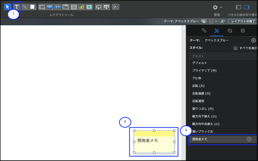 ③ ②を選択したまま、「スタイル」から開発者メモを選択します(背景が黄色になります)。