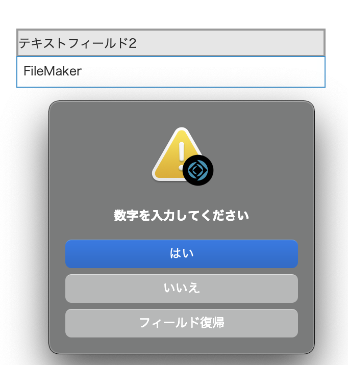 カスタムメッセージが表示され、テキストフィールド1の設定と違って、「はい」と「いいえ」、「フィールド復帰」のボタンが表示されました。