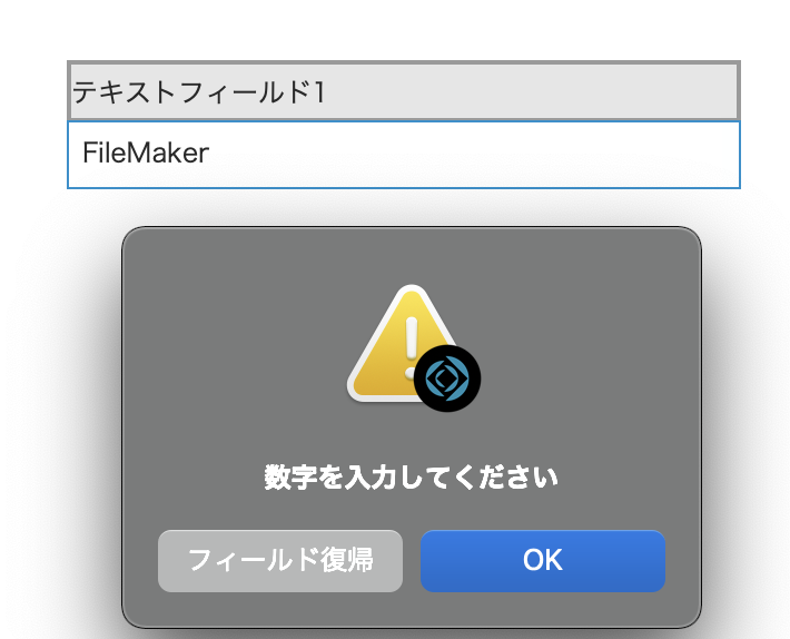 入力値の制限でタイプを「数字」のみとしたため、「数字を入力してください」というカスタムメッセージが表示され、「フィールド復帰」と「OK」というボタンも表示されています。