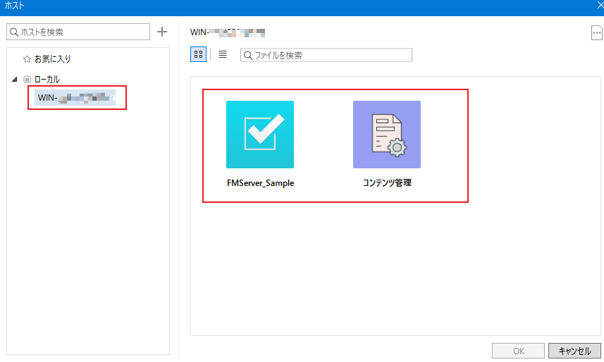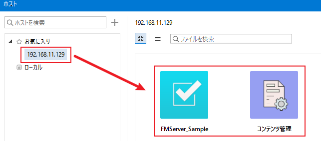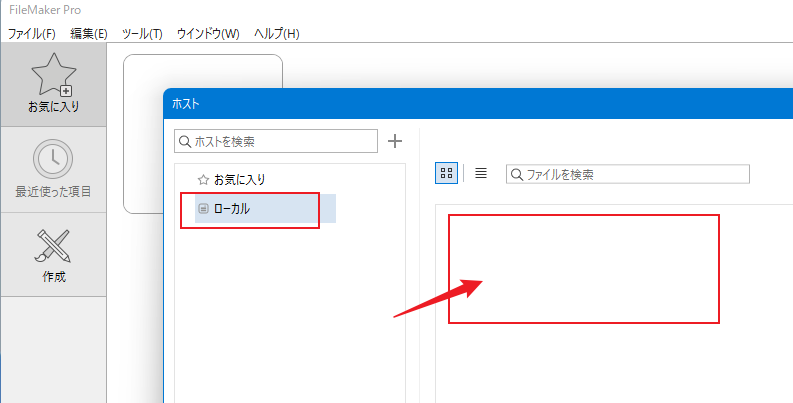 クライアント側の FileMaker Pro 19 を起動して、メニューから「ファイル>ホスト>ホスト」と操作します。「Bonjour」がインストールされているのであれば、「ローカル」を選択した時に画面右側に共有されているファイルの一覧が表示されるはずです。