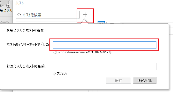 表示させたい場合は、メニューの「ファイル>ホスト>ホストを表示」の画面の「+」のアイコンをクリックして、ホストのインターネットアドレス(IPアドレスまたはサーバー名)を指定します。