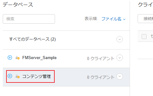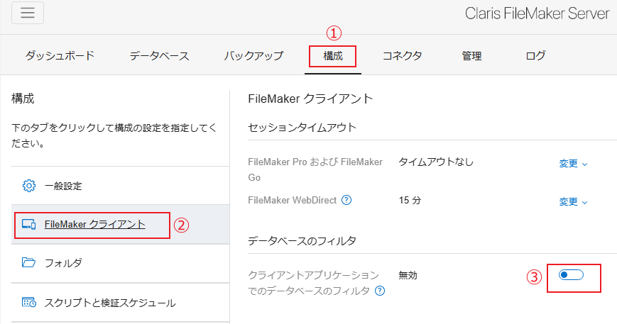 2. Admin Console の「構成> FileMaker クライアント」で「データベースのフィルタ」をオフにします。