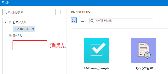 「ローカル」の下にあったサーバー名がなくなりました。ホストのインターネットアドレス(IPアドレスまたはサーバー名)を指定した場合については問題ありません。