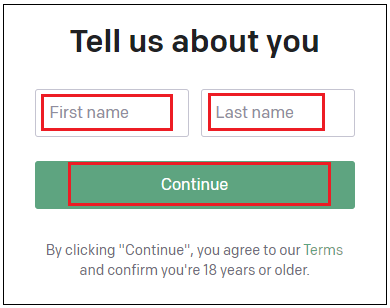 5. 「Tell us about you」画面が表示されますので「名」、「姓」を入力し、「Continue」ボタンを押します。