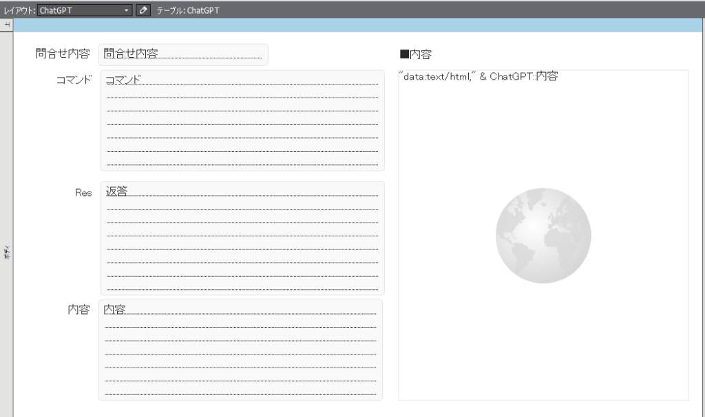 4. 表示用のレイアウトを作成します。左側に各フィールド、右側にWebビューアを配置して「内容」フィールドを設定しています。