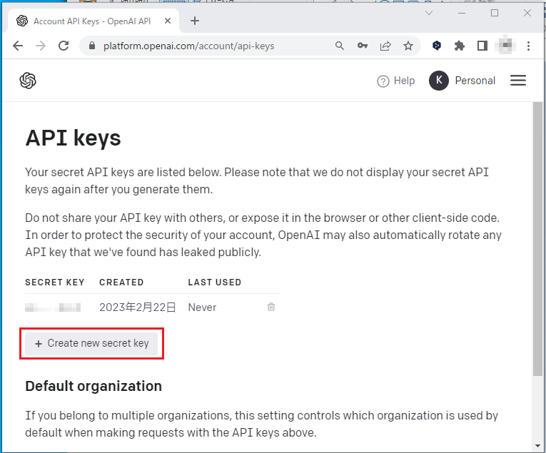 5. 「API keys」画面が表示されますので、「+Create new secret key」ボタンを押します。