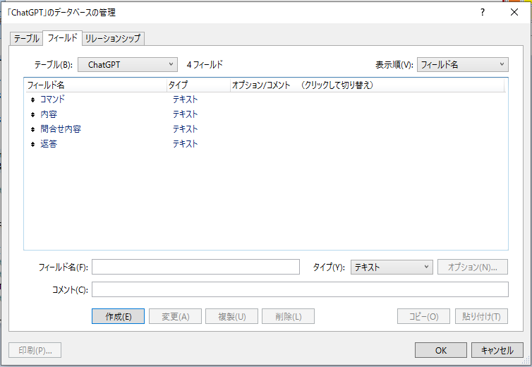 - FileMakerでファイルを新規作成し、以下のフィールドを作成します。