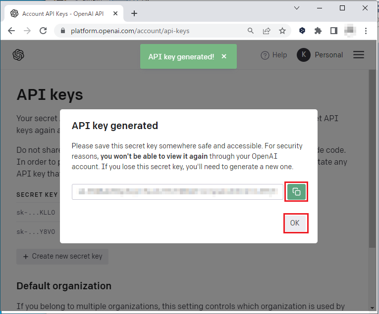 6. 「API key generated」ダイアログが表示されますので、緑のボタンを押します。この時Keyがクリップボードにコピーされます。
