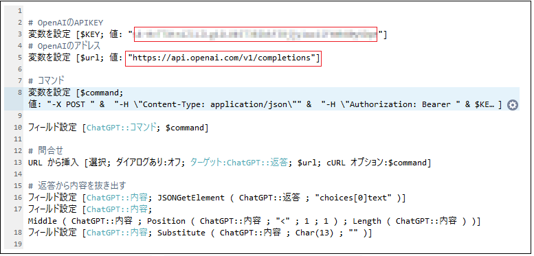 5行目:「$url」変数に OpenAI の api 問合せ先の url を設定します。