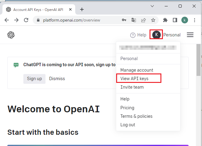 - OpenAI のwebページ(https://openai.com/api)を開き、