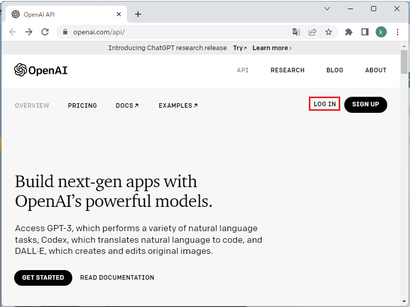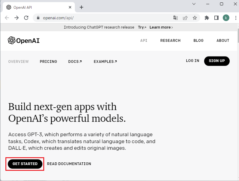 1. OpenAI のwebページ(https://openai.com/api)を開き、
