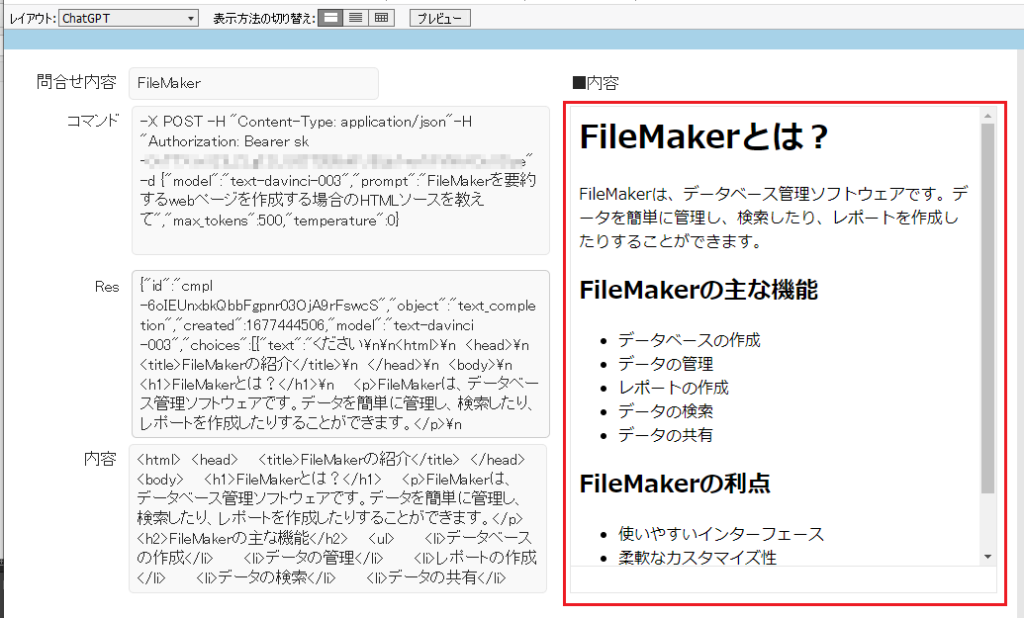 FileMaker のフィールドにある製品名を要約した文章をHTML形式で作成してもらい WebViewer に表示します。