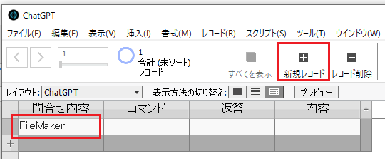 2. レコードを「新規レコード」ボタンを押して追加し、「問合せ内容」フィールドに「FileMaker」と入力します。
