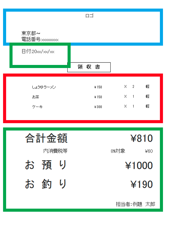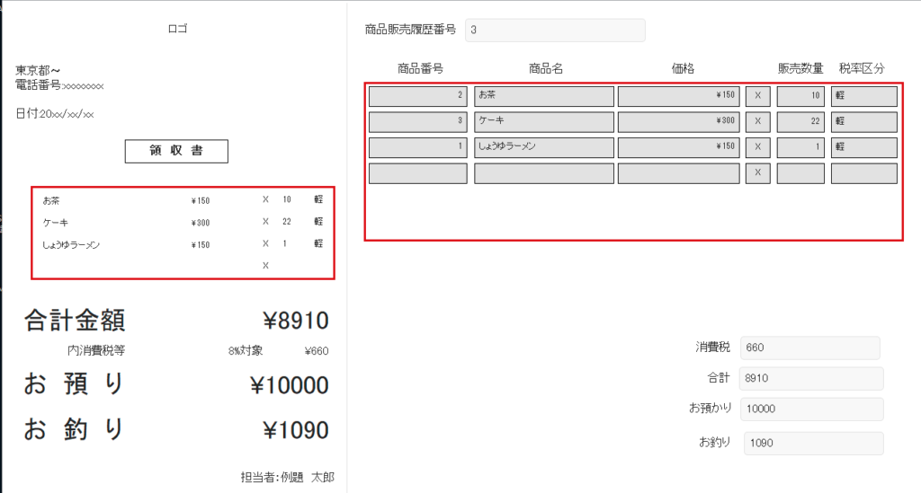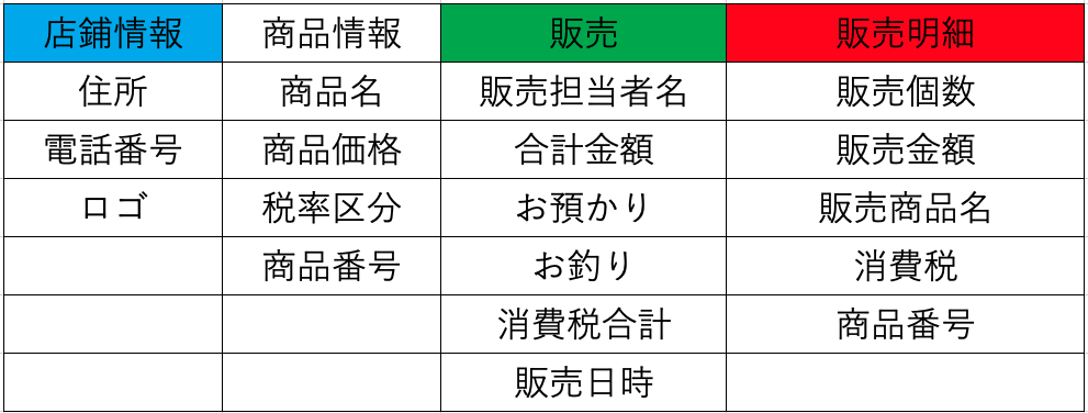 この画面には、店鋪情報、販売日時、商品情報、販売個数、担当者などが必要になります。画面やレシートには表示されませんが、販売明細ごとに、商品コードや消費税率(軽減税率の区分)もあることでしょう。