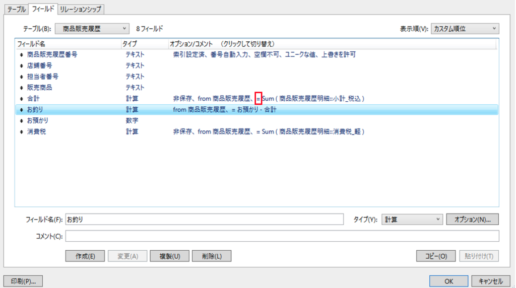 やり方は、設定したいフィールドをダブルクリックでオプションウインドウを開き、