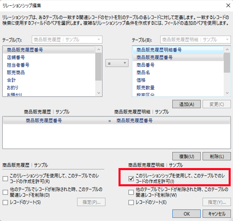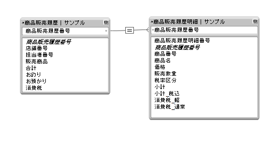 商品販売履歴の商品販売履歴番号をクリックしたまま、商品販売履歴明細の商品販売履歴番号に動かします。