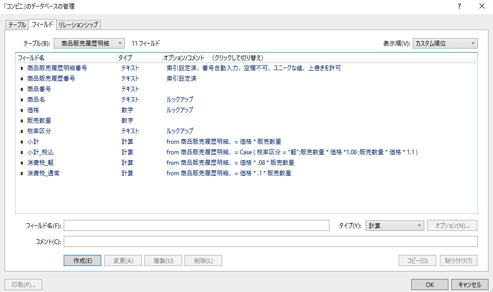 ⑤商品販売履歴テーブルのフィールドはこのようにします。