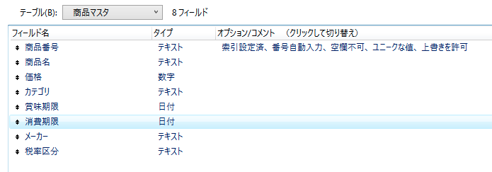 FileMaker で定義した例として、商品マスタのテーブルではこのような情報を管理しています。