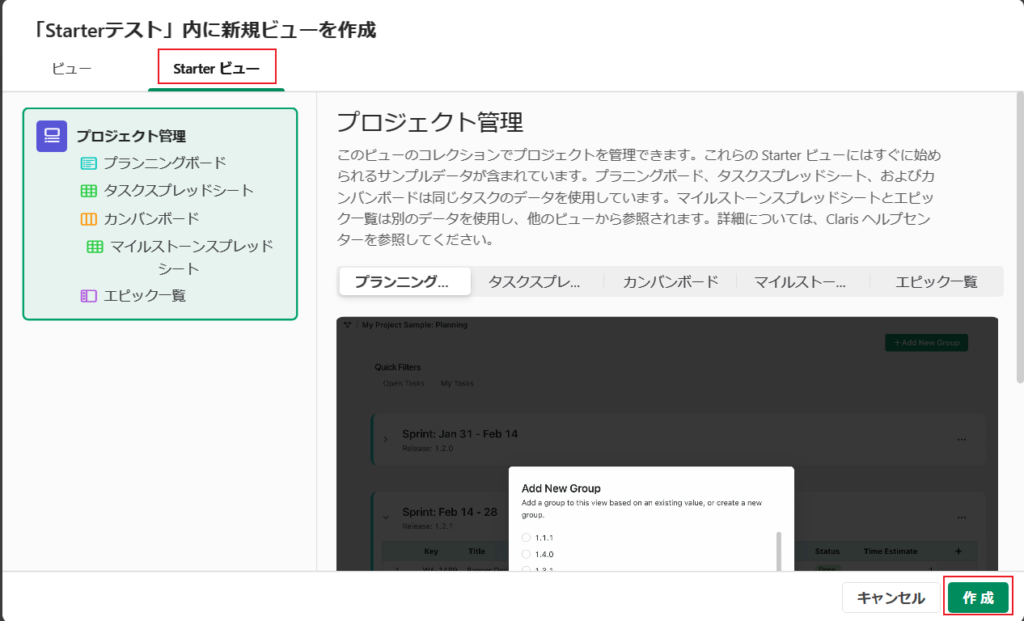 ●「Starterビュー」タブを選択して「作成」ボタンを押します。