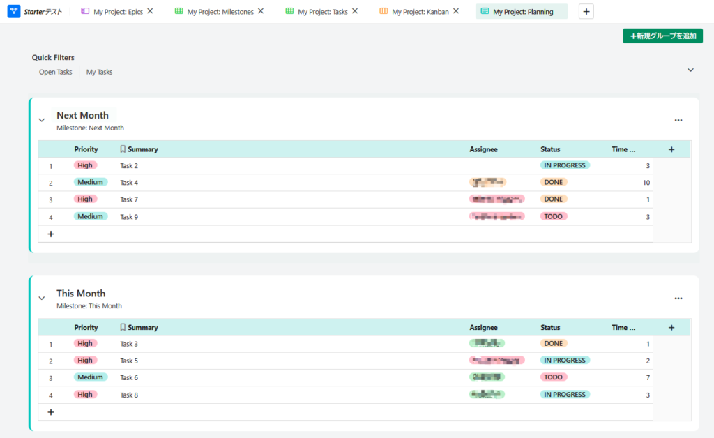 ●「プランニング」ではグループから別のグループにドラッグして、タスクの実行時期を計画できます。