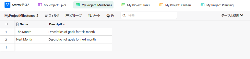●「マイルストーンスプレッドシート」では、タスクビューで設定したマイルスートンを一覧でみることが可能です。