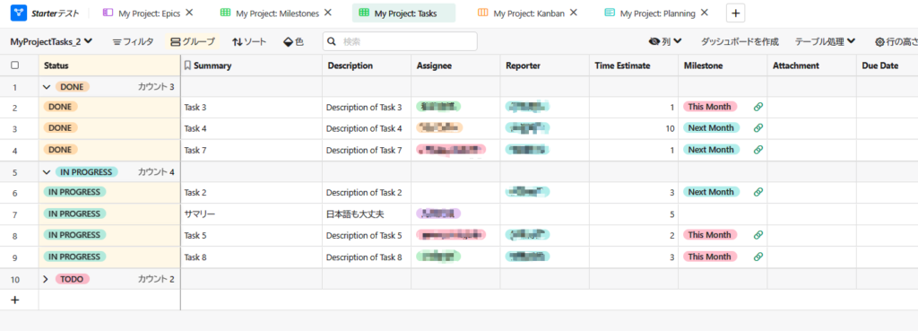 すべてのフィールドが表示されているすべてのタスクのスプレッドシート。このビューではプランニングビューおよびカンバンビューと同じデータを使用するため、ここで行った変更はプランニングビューおよびカンバンビューにも表示されます。別のファイルからのタスクのインポートやプランニングボードにアーカイブされたレコードのグループの表示など、他のビューではできないことをこのビューではすべてを実行できます。