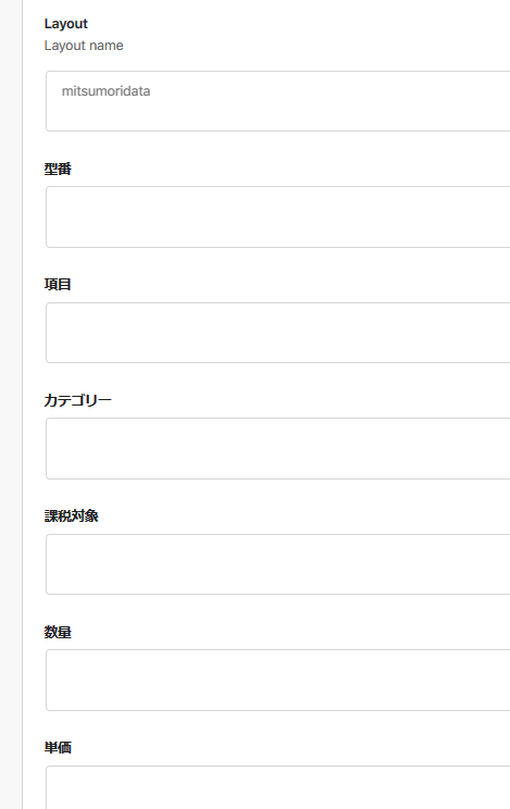 ●レイアウトを選択すると、レイアウトに配置したフィールドが表示されるので設定したい項目を選択して kintone 側から送付されてくるデータ(JSON)との突合せを行なっていきます。