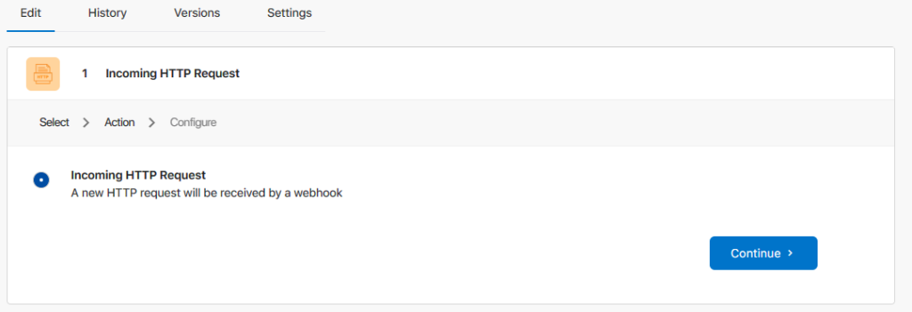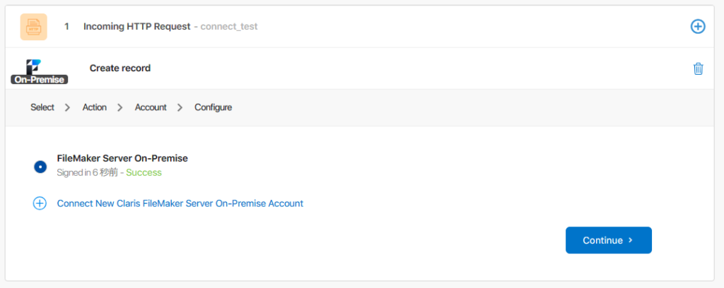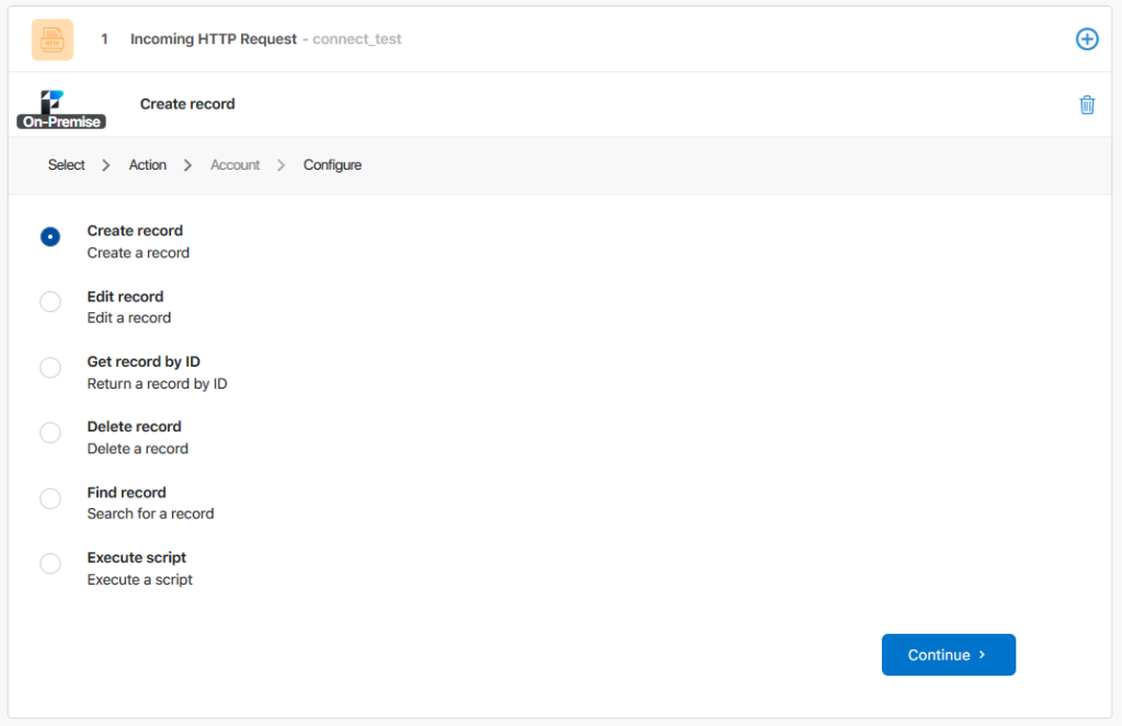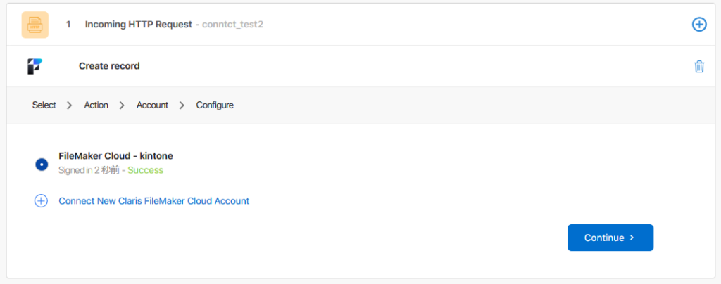 ●Actionの選択肢から今回は「Create record」を選択して「Continue」ボタンをクリックします。