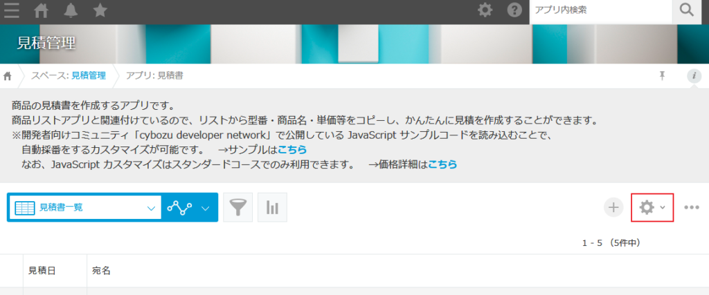 ● kintone の見積管理の画面からアプリの設定アイコンをクリックします。