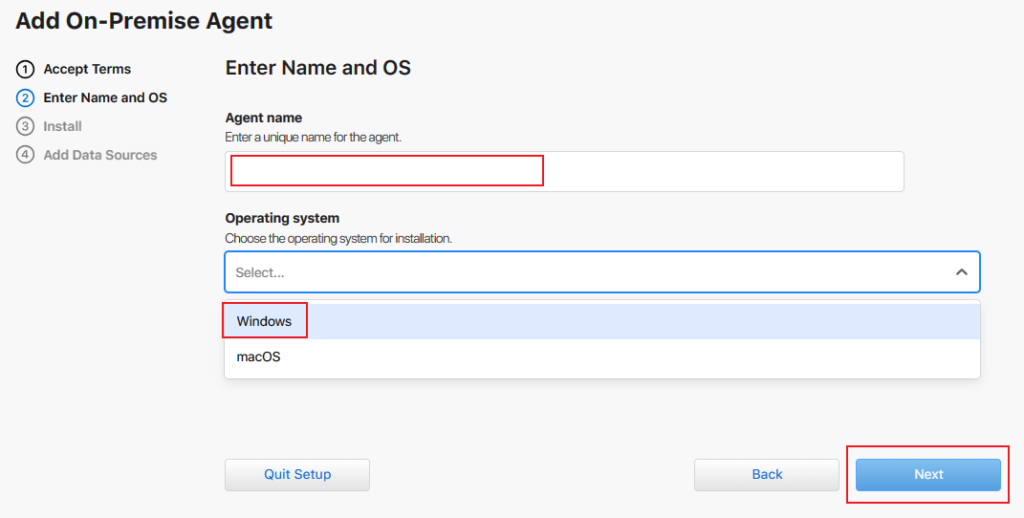 ●「Agent Name」には任意の名称を入力、「Operating system」は Windows Server なので「Winodws」を選択して「Next」ボタンをクリックします。