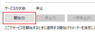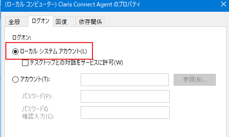 先ほどのインストールでエラーが発生した場合、サービスは起動していないので「ログオン」タブを開いて、「ローカル システム アカウント」にチェックを入れます。