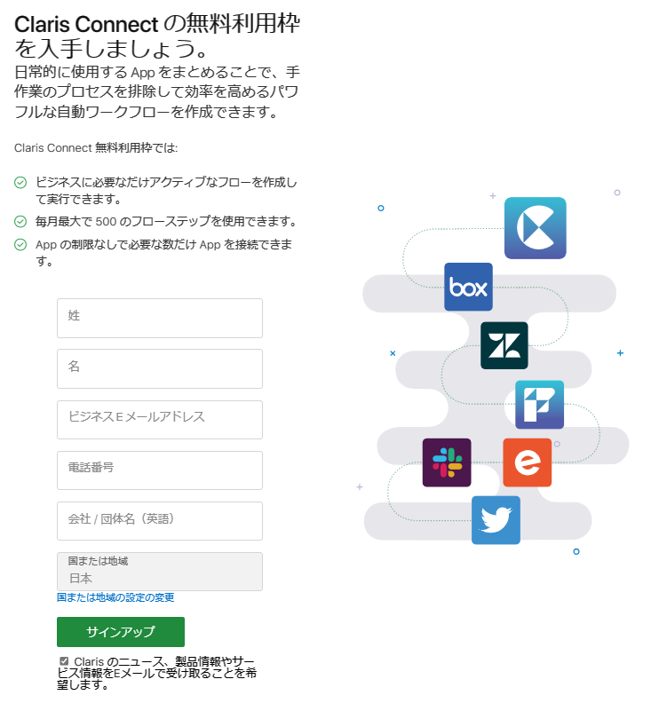 「Claris Connect」の無料利用枠をまだ取得していない方は申し込みをしてください。