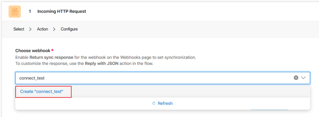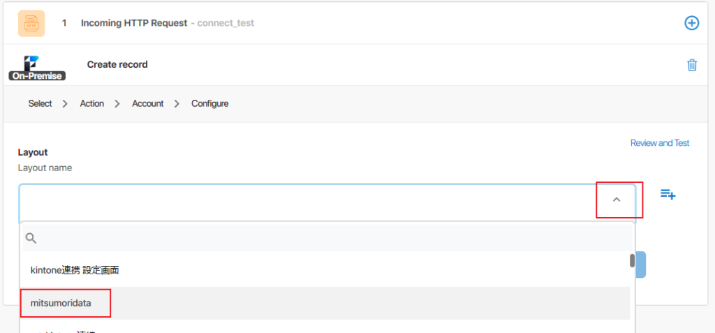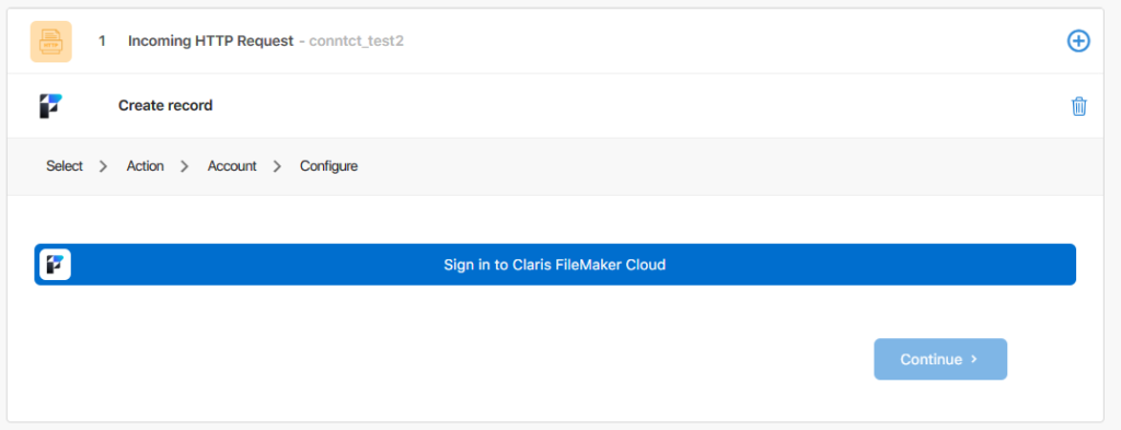 「Action」の選択肢については、今回、通知されてきたデータを用いて FileMaker 側のAppにレコードを新規作成させたいので「Create record」とします。