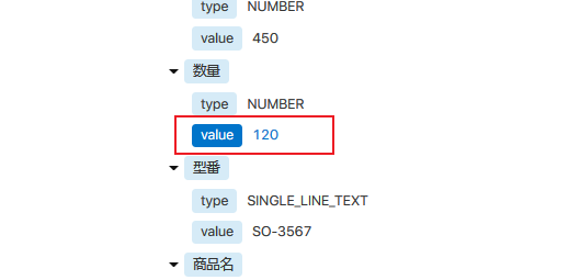 kintone 側からWebhookを通して送付されてきたデータ(JSON)の内容が展開されるのでその中から「数量」を選択します。