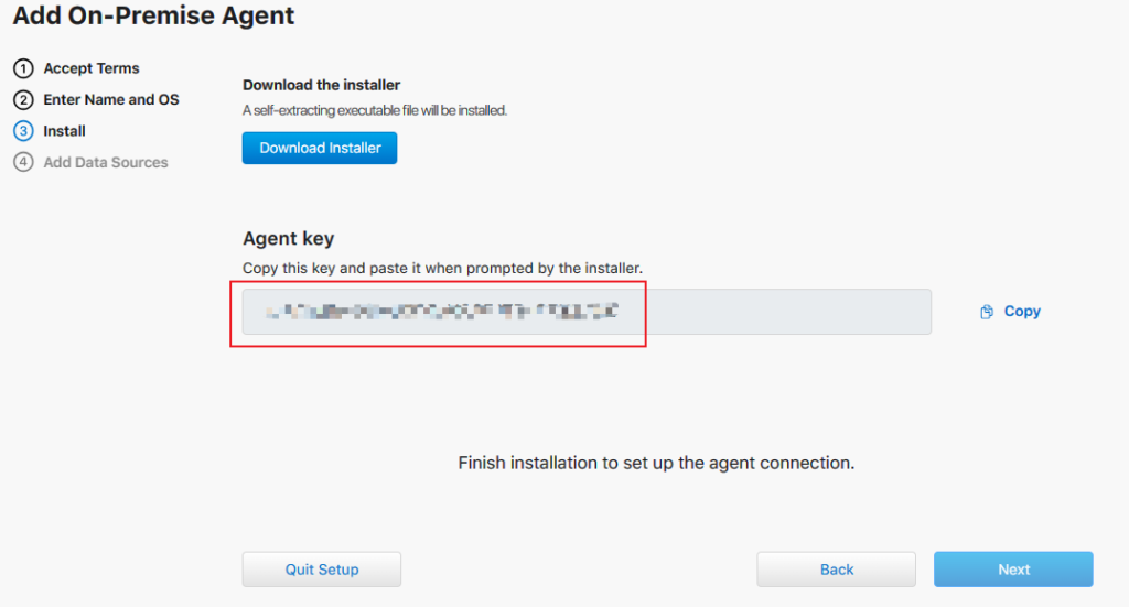 ●「Download Installer」ボタンをクリックして「On-Premise Agents」のインストーラーを保存します。「Agent key」に表示された文字列の内容を控えておきます。