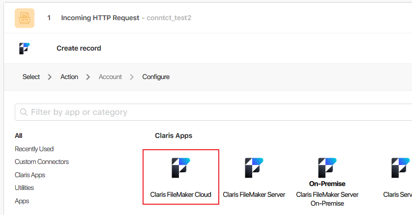 ●Webhookの設定までは同様です。異なるところは「On-Premise Claris FileMaker Server」ではなく「Claris FielMaker Cloud」を選択するところです。