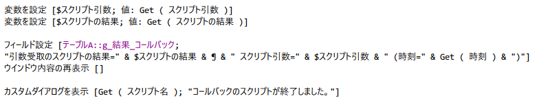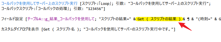 - コールバックスクリプトの「コールバックの処理」の方で、「Get ( スクリプトの結果 )」 を使用して受け取ります。