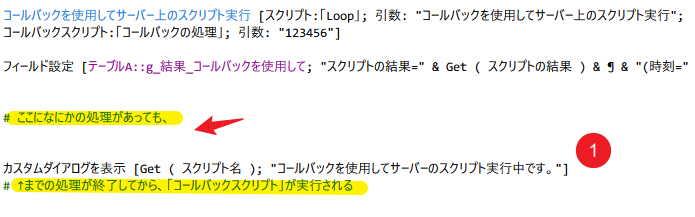サンプルスクリプトの例の場合、赤矢印の部分に処理がたくさんあったとしても、①までの処理が実行された後に「コールバックスクリプト」が実行されます。