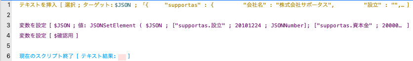 1行: JSONSetElementの項目で利用した、歯抜けのJSONオブジェクトにテキストを挿入しています。