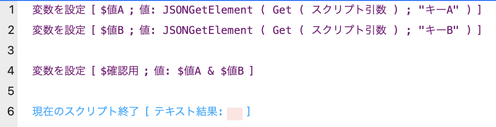 2行: $値Bにスクリプト引数、JSONオブジェクトのキーBを設定する。