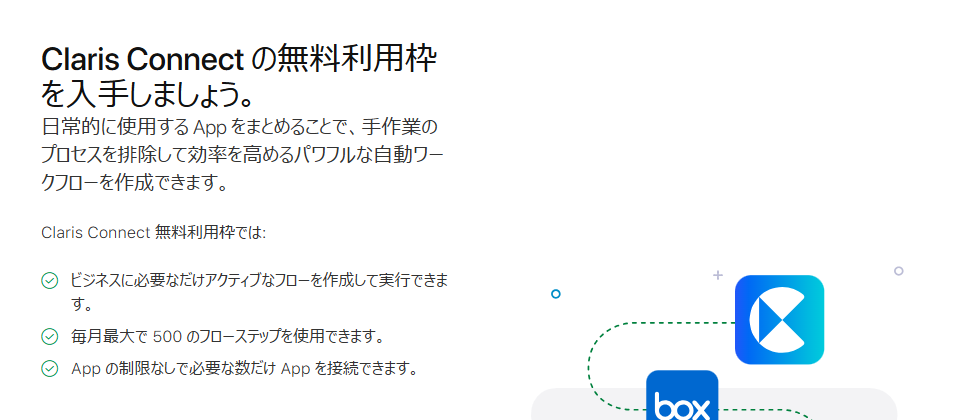 Claris Connectの無料利用枠の取得~設定までは弊社開発ブログ「Claris Connect ~ kintone との連携 ~」を参照ください。