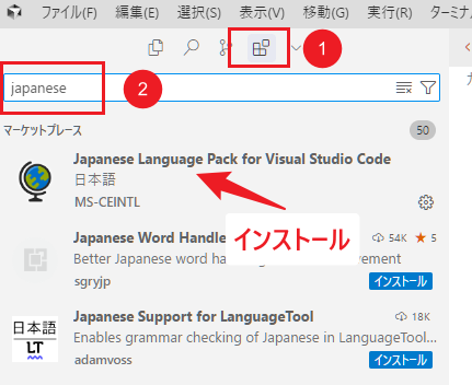 拡張機能ボタンをクリック > 検索に「Japanese」と入力 > 「Japanese Language Pack for Visual Studio Code」を選択してインストール