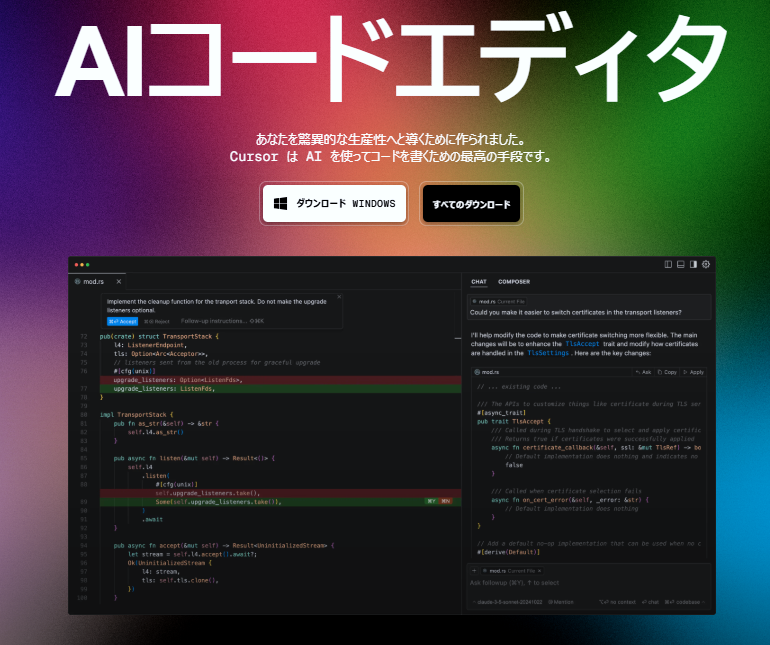 Cursorのインストール、詳細な使い方については参考サイトのリンク先を参照ください。