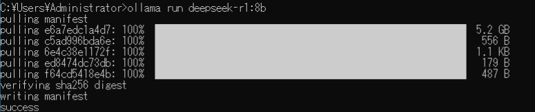 コマンドプロンプトで「ollama run deepseek-r1:8b」を実行します。