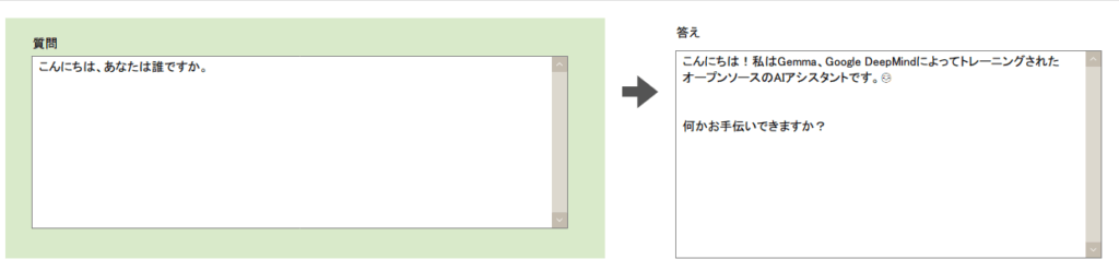 「こんにちは、あなたは誰ですか。日本語で回答してください。」と質問した回答が下記になります。