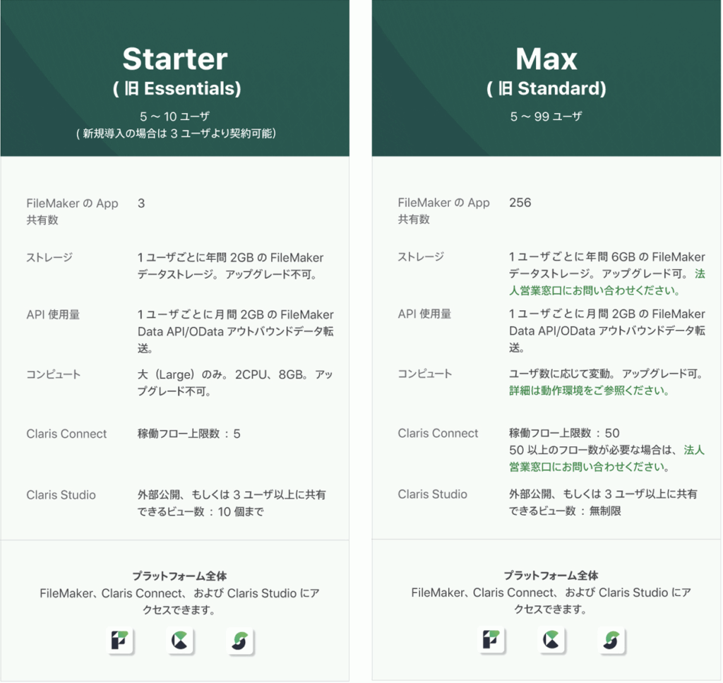 従来のEssentials/Standardプランは「Starter」「Max」に統一され、クラウド利用でも同じ条件で利用できます。